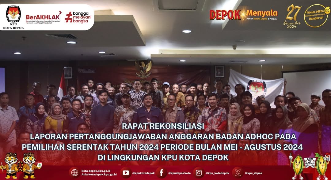 KPU Kota Depok melaksanakan Rapat Rekonsiliasi Laporan Pertanggungjawaban Badan Adhoc pada Pemilihan Serentak Tahun 2024 untuk periode Mei hingga Agustus 2024. Kegiatan ini menjadi bagian dari tahapan akuntabilitas penyelenggaraan Pemilihan Serentak Tahun 2024, khususnya dalam memastikan bahwa seluruh penggunaan anggaran, proses kerja, serta pelaksanaan tugas Badan Adhoc telah dilaksanakan sesuai ketentuan peraturan perundang-undangan. Rapat ini juga menegaskan komitmen KPU Kota Depok terhadap prinsip transparansi dan tanggung jawab publik dalam setiap tahapan pemilihan.