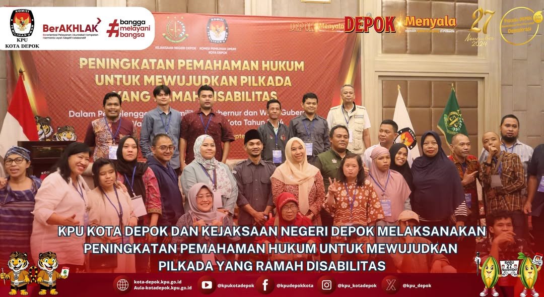 KPU Kota Depok dan Kejaksaan Negeri Depok Gelar Sosialisasi Peningkatan Pemahaman untuk Mewujudkan Pilkada Ramah Disabilitas. Komisi Pemilihan Umum (KPU) Kota Depok bersama Kejaksaan Negeri (Kejari) Depok melaksanakan kegiatan Sosialisasi Peningkatan Pemahaman untuk Mewujudkan Pemilihan Kepala Daerah yang Ramah Disabilitas pada Pilkada Serentak Tahun 2024, bertempat di Hotel Savero Depok, Jalan Margonda No.230A, Kemiri Muka, Kecamatan Beji, Kota Depok, Jawa Barat, pada Kamis (05/09/2024).