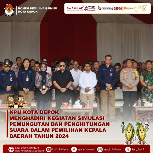 KPU Kota Depok Hadiri Simulasi Pemungutan dan Penghitungan Suara Pilkada 2024 yang Diselenggarakan oleh KPU RI. Komisi Pemilihan Umum (KPU) Kota Depok menghadiri kegiatan Simulasi Pemungutan dan Penghitungan Suara Pilkada Tahun 2024 yang diselenggarakan oleh KPU Republik Indonesia, bertempat di Lapangan Sepak Bola Kukusan, Jalan Palakali, Kukusan, Kecamatan Beji, Kota Depok, Jawa Barat, pada Sabtu (08/09/2024).