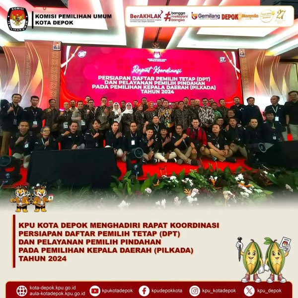 KPU Kota Depok Hadiri Rapat Koordinasi Persiapan DPT dan Pelayanan Pemilih Pindahan pada Pilkada Tahun 2024. KPU Kota Depok menghadiri Rapat Koordinasi Persiapan Daftar Pemilih Tetap (DPT) dan Pelayanan Pemilih Pindahan pada Pemilihan Kepala Daerah (Pilkada) Tahun 2024 yang diselenggarakan oleh KPU Provinsi Jawa Barat.