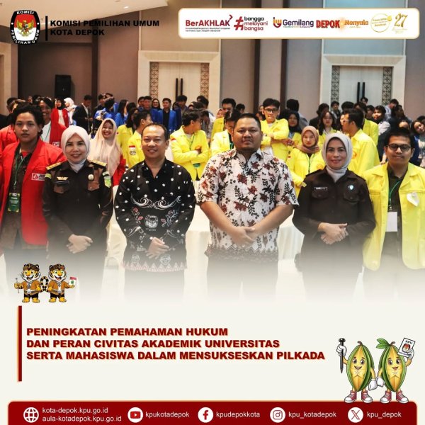 KPU Kota Depok dan Kejaksaan Negeri Depok Gelar Sosialisasi Bersama Civitas Akademika dan Mahasiswa untuk Meningkatkan Partisipasi Pilkada 2024. KPU Kota Depok bersama Kejaksaan Negeri Depok melaksanakan kegiatan Sosialisasi Peningkatan Pemahaman Hukum dan Peran Civitas Akademika Universitas serta Mahasiswa dalam Meningkatkan Partisipasi pada Pemilihan Kepala Daerah Gubernur dan Wakil Gubernur Jawa Barat serta Wali Kota dan Wakil Wali Kota Depok Tahun 2024.