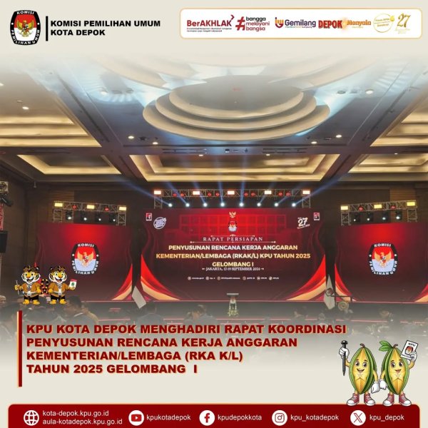 KPU Kota Depok Hadiri Rapat Koordinasi Penyusunan RKA K/L Tahun 2025. Sekretaris KPU Kota Depok Yodi Joko Bintoro bersama Kasubbag Perencanaan, Data dan Informasi Maria Goretti Dwi Sulistyowati serta staf menghadiri Rapat Koordinasi Penyusunan Rencana Kerja dan Anggaran Kementerian/Lembaga (RKA K/L) KPU Tahun 2025 Gelombang I.