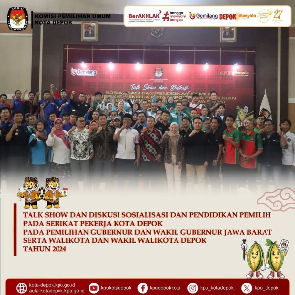 KPU Kota Depok Gelar Talk Show dan Diskusi Sosialisasi Pendidikan Pemilih bagi Serikat Pekerja. Komisi Pemilihan Umum (KPU) Kota Depok melaksanakan kegiatan Talk Show dan Diskusi Sosialisasi serta Pendidikan Pemilih bagi Serikat Pekerja Kota Depok dalam rangka meningkatkan partisipasi masyarakat pada Pemilihan Gubernur dan Wakil Gubernur Jawa Barat serta Wali Kota dan Wakil Wali Kota Depok Tahun 2024. Kegiatan ini menjadi bagian dari upaya KPU untuk memperluas jangkauan pendidikan pemilih ke berbagai lapisan masyarakat, termasuk komunitas pekerja yang memiliki peran strategis dalam demokrasi.