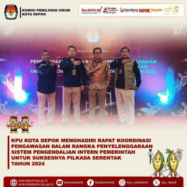 KPU Kota Depok Hadiri Rapat Koordinasi Pengawasan SPIP untuk Pilkada 2024. KPU Kota Depok menghadiri Rapat Koordinasi Pengawasan Sistem Pengendalian Intern Pemerintah (SPIP) dalam rangka menyukseskan Pilkada Serentak Tahun 2024. Kegiatan berlangsung di Kota Ambon pada Minggu–Selasa (6–8 Oktober 2024) dan diikuti oleh perwakilan KPU dari seluruh Indonesia. Rapat ini menjadi bagian penting untuk memperkuat kualitas pengawasan penyelenggaraan pemilihan di tingkat nasional.