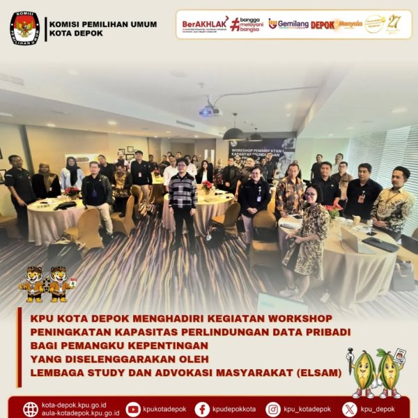 KPU Kota Depok Hadiri Workshop Peningkatan Kapasitas Perlindungan Data Pribadi. KPU Kota Depok menghadiri Workshop Peningkatan Kapasitas Perlindungan Data Pribadi bagi Pemangku Kepentingan yang diselenggarakan oleh Lembaga Studi dan Advokasi Masyarakat (ELSAM). Kegiatan berlangsung di Hotel Mercure Sabang Jakarta, pada Selasa (8 Oktober 2024), sebagai bagian dari upaya memperkuat pengelolaan data pemilih dan keamanan informasi dalam tahapan Pilkada 2024.