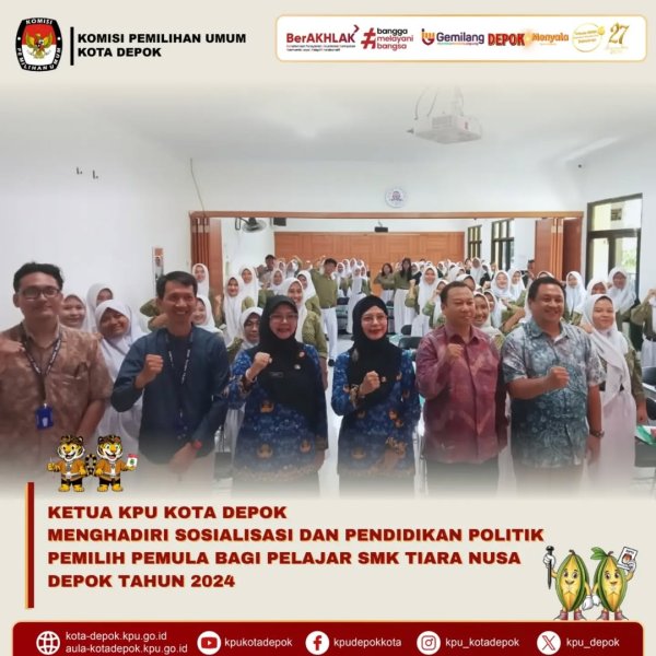 KPU Kota Depok Sosialisasi dan Pendidikan Politik untuk Pemilih Pemula di SMK Tiara Nusa. Ketua KPU Kota Depok menghadiri kegiatan sosialisasi dan pendidikan politik bagi pemilih pemula yang diselenggarakan di SMK Tiara Nusa Depok. Kegiatan ini bertujuan untuk memberikan pemahaman mengenai pentingnya menggunakan hak pilih serta meningkatkan partisipasi pelajar dalam Pilkada Tahun 2024.