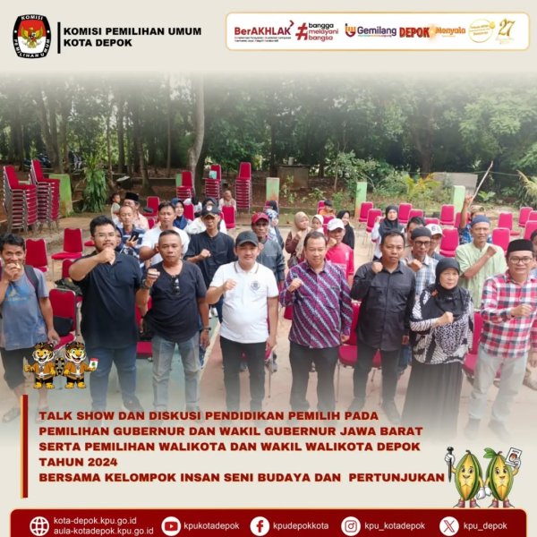 KPU Kota Depok Gelar Talk Show dan Diskusi Pendidikan Pemilih Bersama Kelompok Insan Seni dan Budaya. Depok, 27 Oktober 2024 – KPU Kota Depok melaksanakan kegiatan talk show dan diskusi pendidikan pemilih yang ditujukan bagi masyarakat, khususnya anggota kelompok insan seni, budaya, dan pertunjukan. Kegiatan ini dilaksanakan dalam rangka meningkatkan pemahaman dan partisipasi pemilih pada Pemilihan Gubernur dan Wakil Gubernur Jawa Barat serta Walikota dan Wakil Walikota Depok Tahun 2024. Acara berlangsung di Kantor KPU Kota Depok, Rabu (15 Oktober 2024).