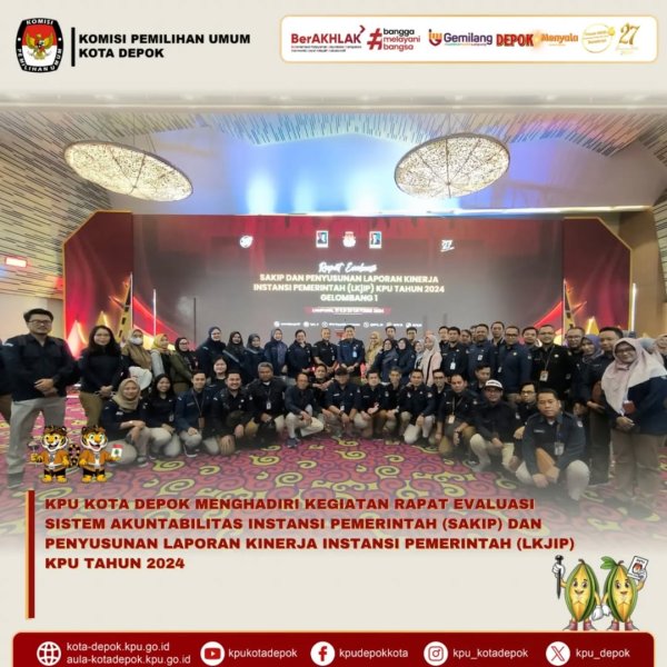 KPU Kota Depok Hadiri Rapat Evaluasi SAKIP dan Penyusunan LKJIP Tahun 2024. Depok, 21–23 Oktober 2024 – Kepala Subbagian Perencanaan, Data, dan Informasi KPU Kota Depok, Maria Goretti Dwi Sulistyowati, bersama staf Sekretariat KPU Kota Depok, menghadiri kegiatan Rapat Evaluasi Sistem Akuntabilitas Instansi Pemerintah (SAKIP) dan Penyusunan Laporan Kinerja Instansi Pemerintah (LKJIP) KPU Tahun 2024. Kegiatan ini diselenggarakan oleh KPU Republik Indonesia bertempat di Hotel Novotel Lampung, Senin hingga Rabu (21–23 Oktober 2024).