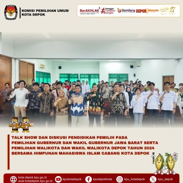 KPU Kota Depok Gelar Talk Show dan Diskusi Pendidikan Pemilih Bersama HMI Kota Depok. Depok, 24 Oktober 2024 – Komisi Pemilihan Umum (KPU) Kota Depok melaksanakan kegiatan talk show dan diskusi pendidikan pemilih bersama Himpunan Mahasiswa Islam (HMI) Cabang Kota Depok. Kegiatan ini digelar untuk meningkatkan pemahaman anggota HMI mengenai tahapan Pilkada, pentingnya partisipasi masyarakat, dan mekanisme penggunaan hak pilih pada Pemilihan Gubernur dan Wakil Gubernur Jawa Barat serta Pemilihan Walikota dan Wakil Walikota Depok Tahun 2024.