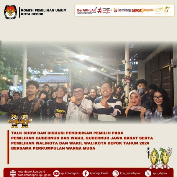 KPU Kota Depok Gelar Talk Show dan Diskusi Pendidikan Pemilih Bersama Perkumpulan Warga Muda. Depok, 25 Oktober 2024 – Komisi Pemilihan Umum (KPU) Kota Depok kembali menggelar kegiatan talk show dan diskusi pendidikan pemilih. Kali ini, kegiatan dilaksanakan bersama Perkumpulan Warga Muda, bertujuan untuk meningkatkan kesadaran politik dan partisipasi masyarakat, khususnya generasi muda, dalam Pemilihan Gubernur dan Wakil Gubernur Jawa Barat serta Pemilihan Walikota dan Wakil Walikota Depok Tahun 2024. Kegiatan ini menekankan pentingnya pemilih muda memahami hak pilih, tahapan Pilkada, dan prinsip demokrasi yang transparan dan akuntabel.