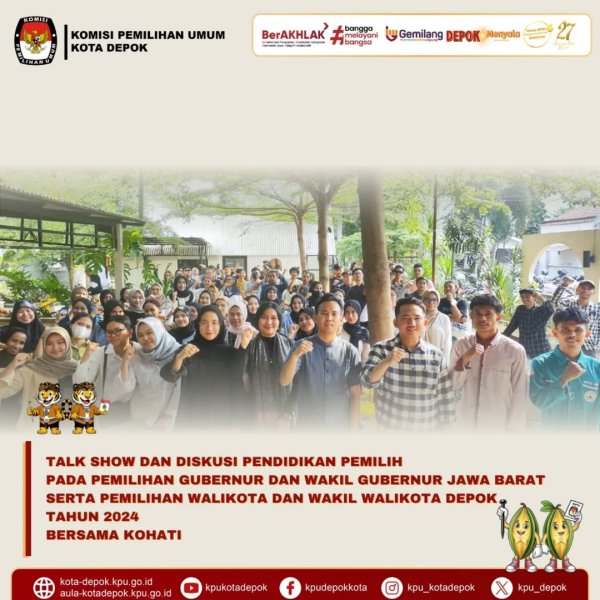 KPU Kota Depok Gelar Talk Show dan Diskusi Pendidikan Pemilih Bersama Kohati. Depok, 27 Oktober 2024 – Komisi Pemilihan Umum (KPU) Kota Depok melaksanakan kegiatan talk show dan diskusi pendidikan pemilih bersama Kohati (Korps HMI-Wati) sebagai bagian dari upaya meningkatkan partisipasi masyarakat, khususnya generasi muda, pada Pemilihan Gubernur dan Wakil Gubernur Jawa Barat serta Pemilihan Walikota dan Wakil Walikota Depok Tahun 2024. Kegiatan ini digelar untuk memberikan pemahaman mendalam mengenai tahapan Pilkada, hak pilih, dan pentingnya peran aktif masyarakat dalam menyukseskan proses demokrasi.