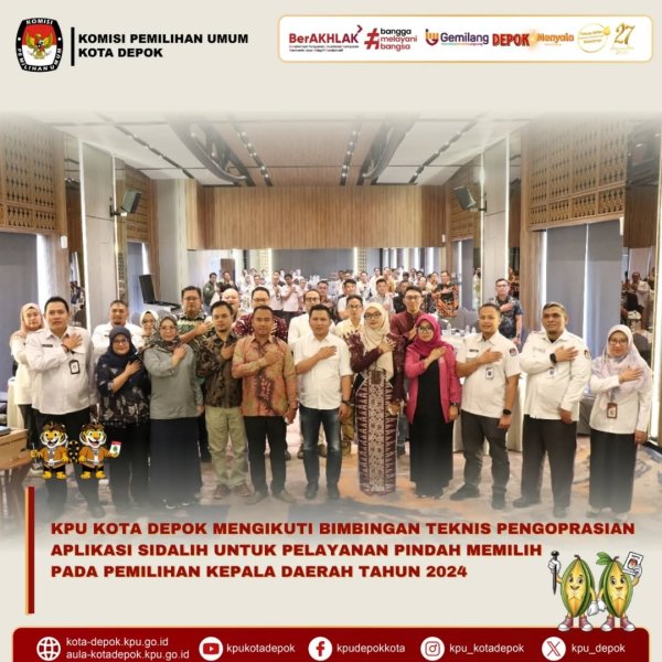 KPU Kota Depok Ikuti Bimbingan Teknis Pengoperasian Aplikasi Sidalih untuk Pelayanan Pindah Memilih. Depok, 28–29 Oktober 2024 – Komisi Pemilihan Umum (KPU) Kota Depok mengikuti Bimbingan Teknis Pengoperasian Aplikasi Sidalih untuk pelayanan pindah memilih, yang diselenggarakan oleh KPU Provinsi Jawa Barat. Kegiatan ini berlangsung di Hotel Grand Palma, Pangandaran, Jawa Barat, pada Selasa–Rabu (28–29 Oktober 2024) dan diikuti oleh perwakilan KPU dari seluruh kabupaten/kota se-Jawa Barat.