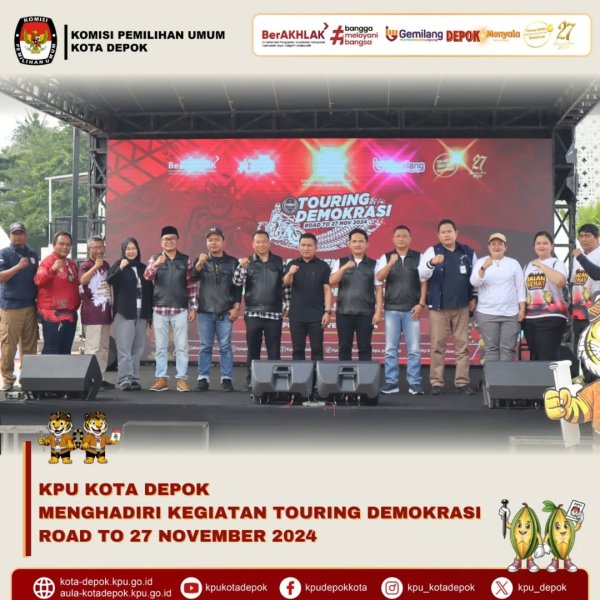 KPU Kota Depok Hadiri Kegiatan Touring Demokrasi Road to 27 November 2024. Depok, 3 November 2024 – Komisi Pemilihan Umum (KPU) Kota Depok menghadiri kegiatan Touring Demokrasi Road to 27 November 2024 yang diselenggarakan oleh KPU Provinsi Jawa Barat. Kegiatan ini dilaksanakan di Taman Alun-Alun dan Hutan Kota Depok, Sawangan Lama, Kecamatan Sawangan, Kota Depok, Jawa Barat, pada hari Minggu, 3 November 2024.