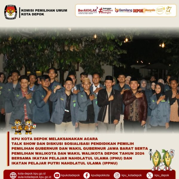 KPU Kota Depok Gelar Talk Show dan Diskusi Pendidikan Pemilih Bersama IPNU dan IPPNU. Depok, 9 November 2024 – Komisi Pemilihan Umum (KPU) Kota Depok melaksanakan kegiatan Talk Show dan Diskusi Sosialisasi Pendidikan Pemilih bagi anggota Ikatan Pelajar Nahdlatul Ulama (IPNU) dan Ikatan Pelajar Putri Nahdlatul Ulama (IPPNU). Kegiatan ini digelar sebagai upaya meningkatkan pemahaman dan partisipasi masyarakat, khususnya generasi muda, dalam Pemilihan Gubernur dan Wakil Gubernur Jawa Barat serta Pemilihan Walikota dan Wakil Walikota Depok Tahun 2024. Acara dilaksanakan pada Sabtu, 9 November 2024.