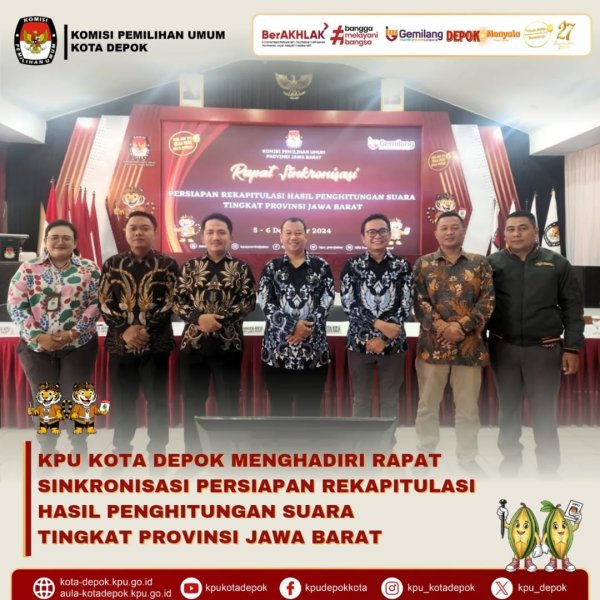 KPU Kota Depok Hadiri Rapat Sinkronisasi Rekapitulasi Hasil Perhitungan Perolehan Suara di Tingkat Provinsi Jawa Barat. Depok, 5–6 Desember 2024 – Ketua KPU Kota Depok, Willi Sumarlin, bersama Anggota KPU Kota Depok, Sekretaris KPU Kota Depok, didampingi Kasubbag Perencanaan Data dan Informasi serta staf sekretariat, mengikuti Rapat Sinkronisasi Rekapitulasi Hasil Perhitungan Perolehan Suara di tingkat Provinsi Jawa Barat Tahun 2024. Kegiatan ini digelar oleh KPU Provinsi Jawa Barat di Aula Setia Permana, Jalan Garut 11, Bandung, pada Kamis dan Jumat (5–6 Desember 2024).