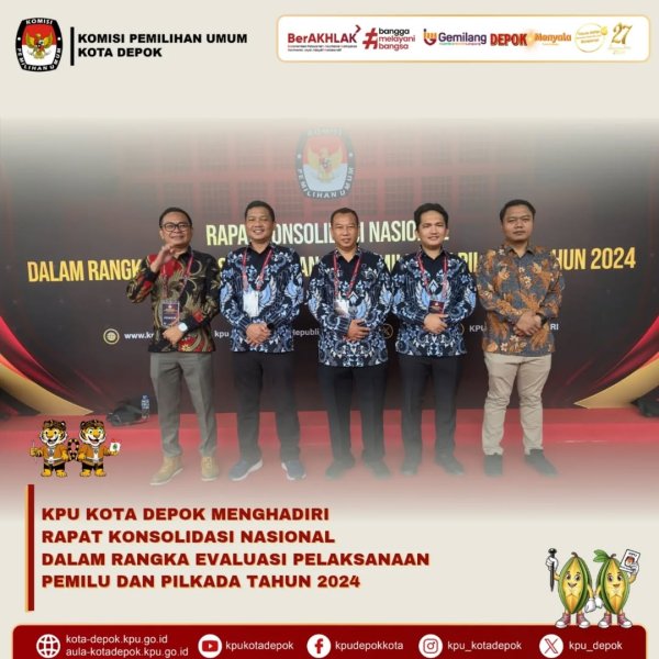 KPU Kota Depok Hadiri Rapat Konsolidasi Nasional Evaluasi Pemilu & Pilkada 2024. Kota Depok – Dalam rangka memperkuat penyelenggaraan demokrasi yang transparan dan akuntabel, Komisi Pemilihan Umum Kota Depok (KPU Kota Depok) melalui program “#TemanPemilih” mengikuti rapat konsolidasi nasional yang diselenggarakan oleh Komisi Pemilihan Umum (KPU) dalam rangka evaluasi pelaksanaan Pemilu dan Pilkada Tahun 2024. Acara tersebut diadakan pada hari Sabtu/Minggu (tanggal persis sesuai sumber Instagram), bertempat di … (lokasi nasional KPU – di Jakarta) — acara ini menjadi momen penting untuk memperkuat sinergi antar-KPU provinsi dan kabupaten/kota seluruh Indonesia.