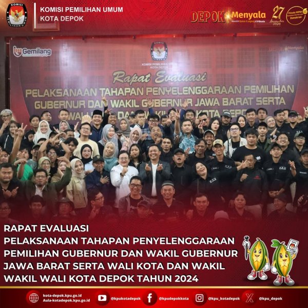 KPU Kota Depok melaksanakan Rapat Evaluasi Pelaksanaan Tahapan Penyelenggaraan Pemilihan Gubernur dan Wakil Gubernur Jawa Barat serta Wali Kota dan Wakil Wali Kota Depok Tahun 2024. Kegiatan ini dilaksanakan di Hotel Bumi Wiyata, Jl. Margonda No.281, Kemiri Muka, Kecamatan Beji, Kota Depok, Jawa Barat, pada Rabu hingga Kamis, 22–23 Januari 2025. Rapat evaluasi ini menjadi bagian penting dari tahapan penyelenggaraan Pemilihan Serentak Tahun 2024, khususnya dalam menilai sejauh mana pelaksanaan setiap tahapan berjalan sesuai ketentuan peraturan perundang-undangan, serta untuk memperkuat tata kelola dan kinerja kelembagaan KPU Kota Depok dalam mewujudkan pemilu yang berintegritas, transparan, dan akuntabel.