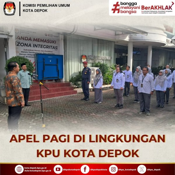 KPU Kota Depok melaksanakan apel pagi rutin di halaman Kantor KPU Kota Depok, Jalan Margonda Raya No. 379, Kelurahan Kemiri Muka, Kecamatan Beji, Kota Depok, pada Senin, 7 Juli 2025. Kegiatan ini diikuti oleh seluruh jajaran pegawai, mulai dari Pejabat Struktural, PNS, P3K, hingga PPNPN, dan dipimpin langsung oleh Ketua KPU Kota Depok, Willi Sumarlin.