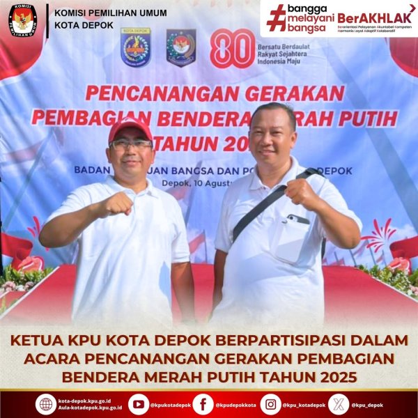 KPU Kota Depok berpartisipasi aktif dalam Pencanangan Gerakan Pembagian Bendera Merah Putih 2025, yang berlangsung pada Rabu, 09 Agustus 2025, bertempat di Alun-Alun Kota Depok, Kecamatan Pancoran Mas, Kota Depok, Jawa Barat. Kegiatan ini menjadi bagian dari rangkaian peringatan kemerdekaan dan upaya menumbuhkan rasa cinta tanah air melalui simbol kebangsaan, yaitu bendera merah putih.
