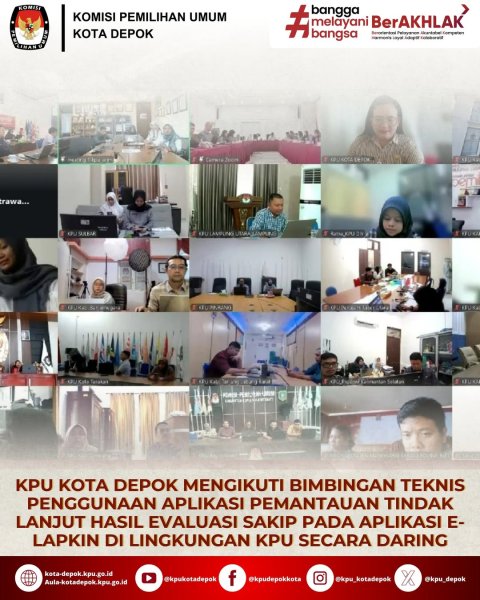 KPU Kota Depok melalui Subbagian Perencanaan, Data, dan Informasi mengikuti kegiatan Bimbingan Teknis (Bimtek) Aplikasi Pemantauan Tindak Lanjut Hasil Evaluasi Sistem Akuntabilitas Kinerja Instansi Pemerintah (SAKIP) melalui platform E-Lapkin, yang diselenggarakan secara daring melalui Zoom Meeting pada Selasa, 16 September 2025.