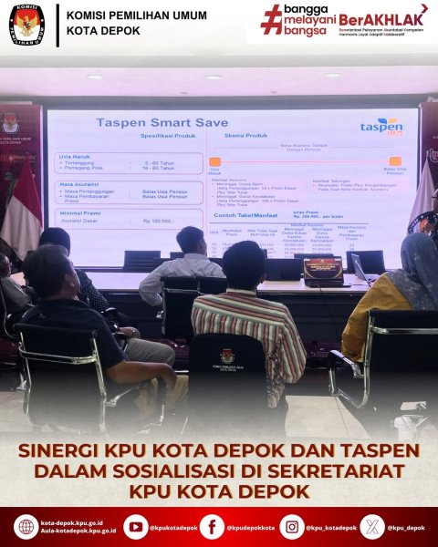 Komisi Pemilihan Umum (KPU) Kota Depok bekerja sama dengan PT Taspen (Persero) menyelenggarakan Sosialisasi Program Layanan Taspen di lingkungan Sekretariat KPU Kota Depok. Kegiatan ini dilaksanakan di Ruang Rapat Utama KPU Kota Depok, Jl. Margonda Raya No.529, Kemiri Muka, Kecamatan Beji, Kota Depok, Jawa Barat, dengan tujuan meningkatkan pemahaman aparatur mengenai hak-hak kepegawaian serta memperkuat jaminan kesejahteraan bagi seluruh pegawai.