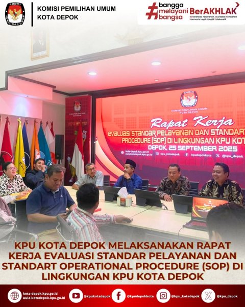 Komisi Pemilihan Umum (KPU) Kota Depok melaksanakan Rapat Kerja Evaluasi Standar Pelayanan dan Standar Operational Procedure (SOP) di lingkungan Sekretariat KPU Kota Depok. Kegiatan ini menjadi bagian dari agenda kelembagaan yang berorientasi pada peningkatan kualitas tata kelola organisasi dan layanan publik di bidang kepemiluan.