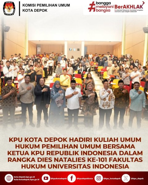 Komisi Pemilihan Umum (KPU) Kota Depok turut hadir dalam kegiatan Kuliah Umum Hukum Pemilihan Umum yang disampaikan oleh Ketua KPU Republik Indonesia, Mochammad Afifuddin, pada Senin, 13 Oktober 2025, bertempat di Aula Fakultas Hukum Universitas Indonesia, Kampus UI Depok. Kegiatan ini diselenggarakan dalam rangka memperingati Dies Natalies ke-101 Fakultas Hukum Universitas Indonesia (FH UI), dengan mengusung semangat memperkuat pemahaman hukum dan integritas dalam penyelenggaraan pemilu di Indonesia. Hadir dalam kegiatan tersebut Ketua KPU Kota Depok, Willi Sumarlin, didampingi oleh anggota KPU Kota Depok, serta Sekretaris KPU Kota Depok dan jajaran staf sekretariat. Turut serta pula unsur civitas akademika dari Fakultas Hukum UI, dosen, mahasiswa, dan perwakilan lembaga penyelenggara pemilu dari berbagai daerah.