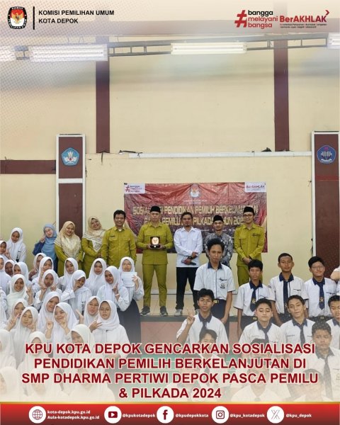 KPU Kota Depok menyelenggarakan Sosialisasi Pendidikan Pemilih Berkelanjutan di SMP Dharma Pertiwi Depok, pada Selasa, 4 November 2025. Kegiatan ini menjadi bagian dari komitmen KPU untuk menumbuhkan kesadaran berdemokrasi sejak dini, serta membangun karakter generasi muda yang inklusif, cerdas, dan bertanggung jawab dalam kehidupan demokrasi.