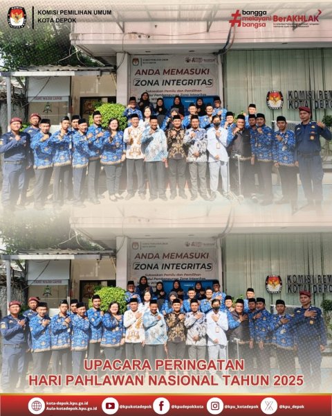 KPU Kota Depok melaksanakan Upacara Peringatan Hari Pahlawan Nasional Tahun 2025 dengan tema “Pahlawan Terus Bergerak, Melanjutkan Perjuangan”. Upacara ini diikuti oleh Ketua dan Anggota KPU Kota Depok, beserta seluruh jajaran Sekretariat KPU Kota Depok. Kegiatan ini berlangsung dengan khidmat sebagai bentuk penghormatan dan refleksi atas jasa para pahlawan yang telah berjuang untuk kemerdekaan dan kemajuan bangsa.