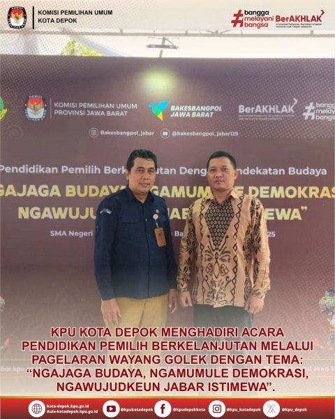 KPU Kota Depok turut menghadiri kegiatan Pendidikan Pemilih Berkelanjutan melalui Pagelaran Wayang Golek dengan tema “Ngajaga Budaya, Ngamumule Demokrasi, Ngawujudkeun Jabar Istimewa”. Kegiatan ini diselenggarakan oleh KPU Provinsi Jawa Barat pada Selasa, 11 November 2025, bertempat di SMA Negeri 1 Soreang, Kabupaten Bandung. Kegiatan ini menjadi ajang penting untuk menggabungkan pelestarian budaya dan penguatan nilai-nilai demokrasi, menjadikannya sebuah sinergi yang menyatukan dua aspek penting dalam kehidupan berbangsa.