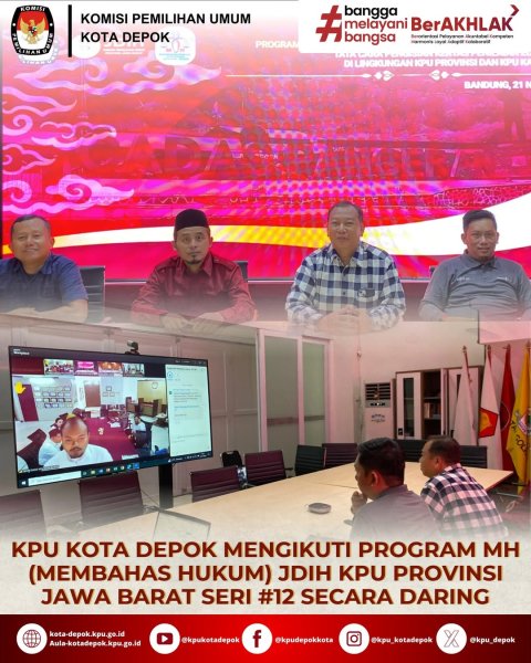 KPU Kota Depok tengah mengikuti Program MH (Membahas Hukum) JDIH KPU Provinsi Jawa Barat Seri #12 secara daring. Kegiatan ini diikuti oleh jajaran Komisioner dan Sekretariat KPU Kota Depok sebagai bagian dari upaya penguatan pemahaman regulasi kepemiluan dan peningkatan kapasitas kelembagaan dalam bidang hukum kepemiluan. Acara dilaksanakan pada Kamis, 27 November 2025.