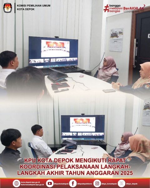 Komisi Pemilihan Umum (KPU) Kota Depok mengikuti Rapat Koordinasi yang diselenggarakan oleh KPU Provinsi Jawa Barat pada Selasa, 23 Desember 2025, dengan agenda membahas langkah-langkah akhir tahun anggaran 2025. Rapat yang diadakan secara daring ini bertujuan untuk memastikan kesiapan satuan kerja di seluruh KPU Kabupaten/Kota dalam menyelesaikan tahapan akhir tahun anggaran dengan tertib dan tepat waktu, serta sesuai dengan ketentuan peraturan yang berlaku.