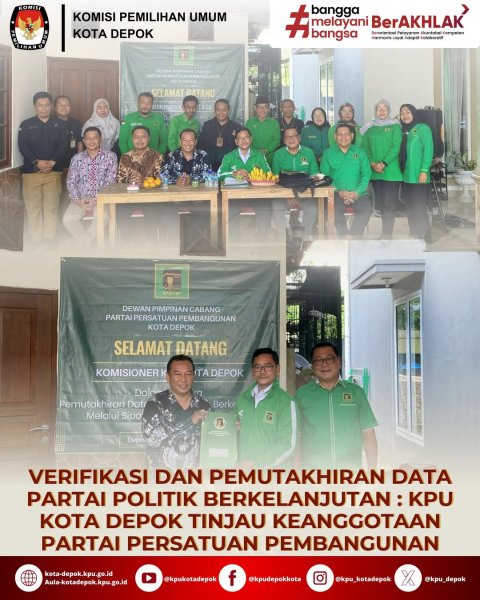 KPU Kota Depok melaksanakan Verifikasi dan Pemutakhiran Data Partai Politik Berkelanjutan dengan melakukan peninjauan terhadap keanggotaan Partai Persatuan Pembangunan (PPP) pada Rabu, 24 Desember 2025. Kegiatan ini dihadiri oleh Ketua KPU Kota Depok, Willi Sumarlin, Kadiv Teknis Penyelenggaraan Pemilu, Dicky Hadi Wijaya, dan Kadiv Parmas & SDM, Achmad Firdaus.