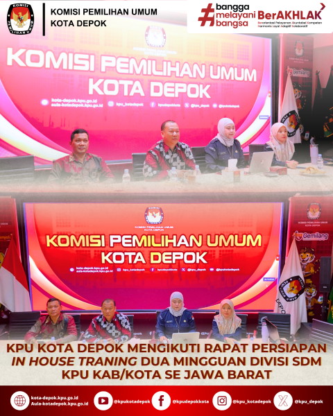 KPU Kota Depok mengikuti Rapat Persiapan In House Training (IHT) dua mingguan Divisi SDM KPU Kabupaten/Kota se-Jawa Barat yang dilaksanakan secara daring sebagai bagian dari penguatan koordinasi dan kesiapan pelaksanaan agenda peningkatan kapasitas sumber daya manusia. Kegiatan ini menjadi forum konsolidasi untuk menyamakan pemahaman teknis, mematangkan rencana pelaksanaan, serta memastikan setiap tahapan persiapan berjalan tertib dan terukur. Melalui partisipasi tersebut, KPU Kota Depok menegaskan komitmennya untuk terus mendorong pengembangan kompetensi aparatur melalui mekanisme pelatihan yang terstruktur dan berkelanjutan. Selasa, 20 Januari 2026.