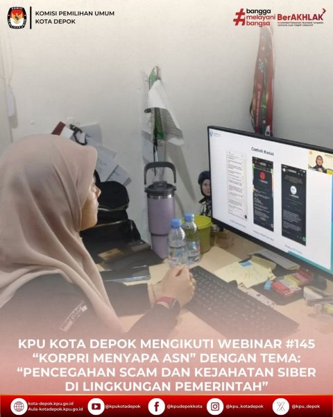 Depok - Komisi Pemilihan Umum (KPU) Kota Depok mengikuti Seri Webinar #145 “KORPRI Menyapa ASN” dengan tema “Pencegahan Scam dan Kejahatan Siber di Lingkungan Pemerintah” pada Rabu, 21 Januari 2026. Kegiatan ini dilaksanakan secara daring dan diikuti oleh jajaran KPU Kota Depok.