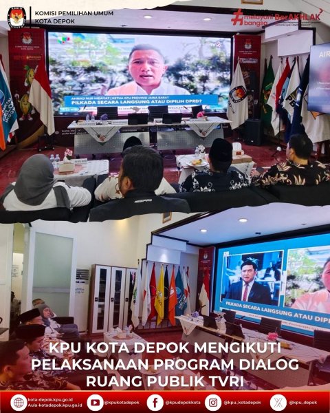 Depok - KPU Kota Depok mengikuti pelaksanaan Program Dialog Ruang Publik di TVRI, yang diselenggarakan untuk membahas topik penting mengenai Pilkada. Acara ini menjadi wadah diskusi publik tentang apakah Pilkada sebaiknya dilaksanakan secara langsung oleh masyarakat atau melalui pemilihan oleh DPRD. Kegiatan ini diikuti oleh seluruh Ketua dan Anggota, serta jajaran Sekretariat KPU Kota Depok yang menyaksikan siaran langsung yang sangat informatif.