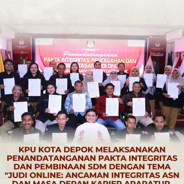 Depok - KPU Kota Depok mengikuti kegiatan Penandatanganan Pakta Integritas pada Rabu, 28 Januari 2026 yang diselenggarakan oleh KPU Provinsi Jawa Barat, sebagai bentuk komitmen bersama dalam pencegahan dan pemberantasan judi online di lingkungan kerja. Kegiatan ini menjadi langkah nyata untuk memperkuat budaya kerja bersih serta menjaga integritas aparatur dalam menjalankan tugas kelembagaan.