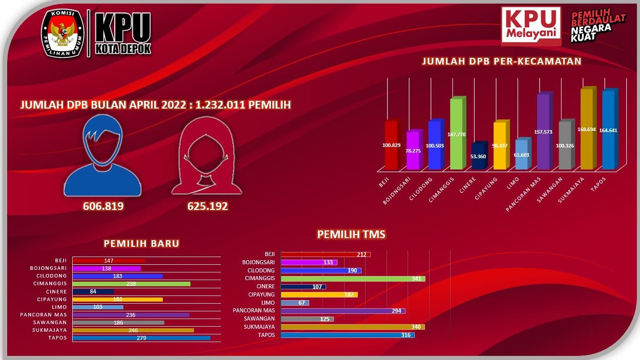 Rapat Pleno Internal Daftar Pemilih Berkelanjutan Periode Bulan April Tahun 2022 Depok – Komisi Pemilihan Umum Kota Depok melaksanakan Rapat Pleno Internal Data Pemilih Berkelanjutan Tahun 2022 Periode Bulan April tingkat Kota Depok yang diselenggarakan pada hari Selasa, 26 April 2022 pukul 09.00 WIB s/d selesai, Rapat Pleno Internal yang dihadiri oleh Anggota dan Ketua KPU, dilaksanakan di Ruang Rapat Kantor KPU Kota Depok Jl.Margonda Raya No. 379 Beji, Kota Depok. Kegiatan Rapat Koordinasi ini dilaksanakan berdasarkan ketentuan Peraturan Komisi Pemilihan Umum Republik Indonesia Nomor 6 Tahun 2021. Adapun hasil Rapat Koordinasi Bulanan Data Pemilih Berkelanjutan Tahun 2022 Periode April di Kota Depok menghasilkan rekapitulasi jumlah pemilih sebagai berikut : Pemilih laki-laki berjumlah 606.819 Pemilih perempuan berjumlah 625.192 Jumlah total pemilih sebanyak 1.232.011 DEPOK, 26 APRIL 2022 DIVISI PERENCANAAN, DATA DAN INFORMASI Unduh BA DPB Bulan April 2022