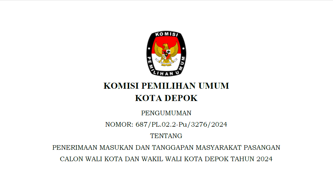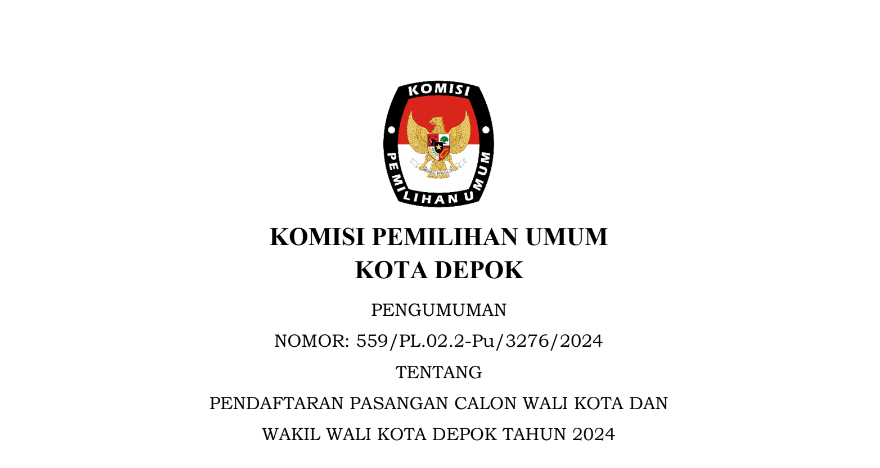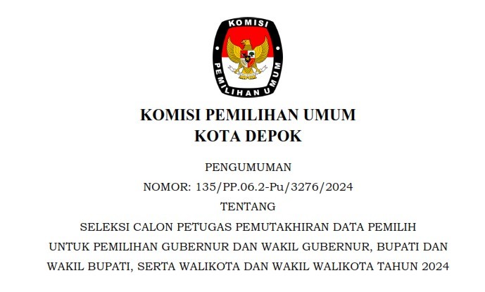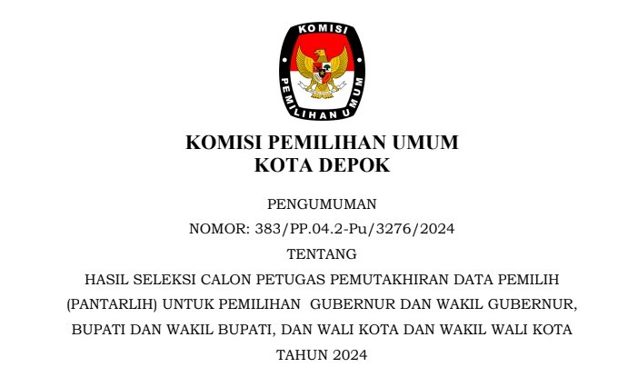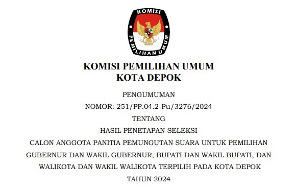 kota-depok.kpu.go.id- Komisi Pemilihan Umum (KPU) Kota Depok mengumumkan Penetapan Hasil seleksi calon Anggota Panitia Pemungutan Suara untuk Pemilihan Gubernur dan Wakil Gubernur, Bupati dan Wakil Bupati serta Wali Kota dan Wakil Wali Kota Tahun 2024. Informasi selengkapnya KLIK DISINI