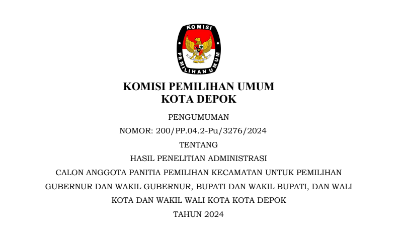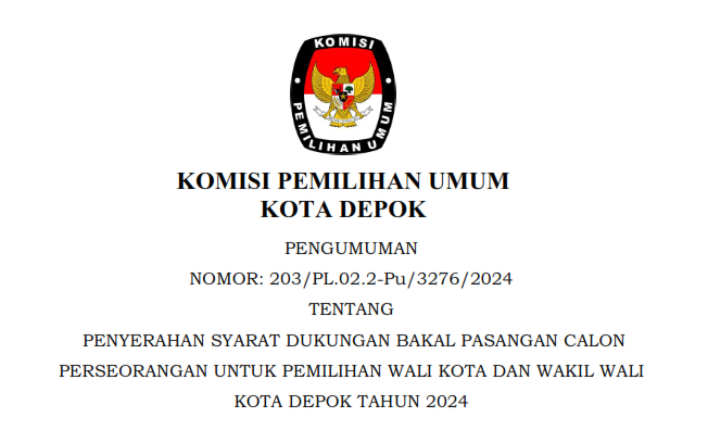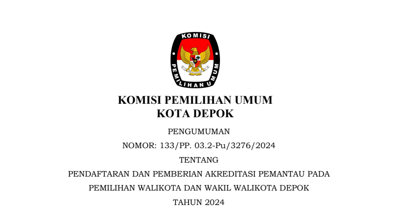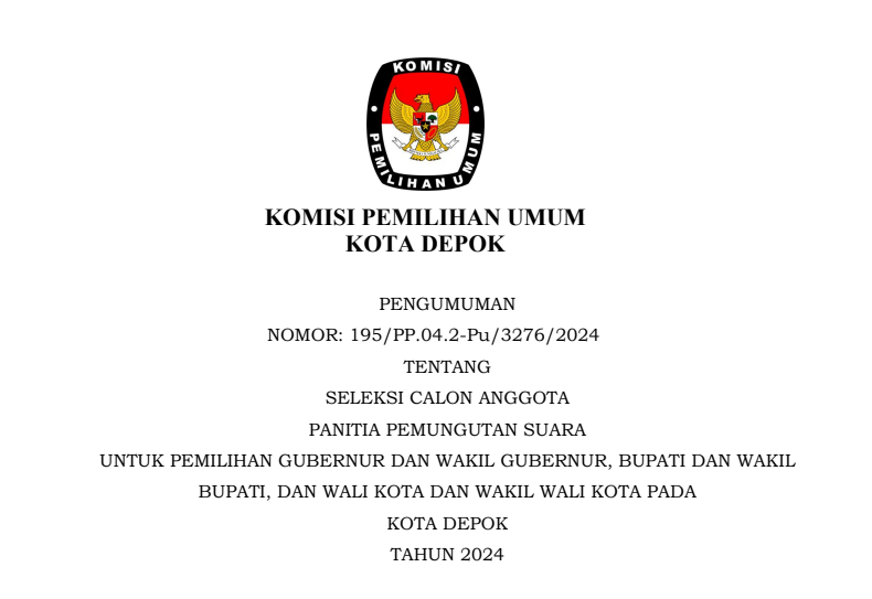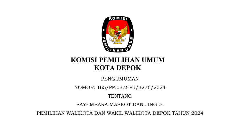 Berdasarkan Peraturan Komisi Pemilihan Umum Nomor 2 Tahun 2024 tentang Tahapan dan Jadwal Pemilihan Gubernur dan Wakil Gubernur, Bupati dan Wakil Bupati, serta Walikota dan Wakil Walikota Tahun 2024, dengan ini Komisi Pemilihan Umum Provinsi Kota Depok mengadakan Sayembara Maskot dan Jingle Pemilihan Walikota dan Wakil Walikota Depok Tahun 2024 dengan ketentuan sebagai berikut: