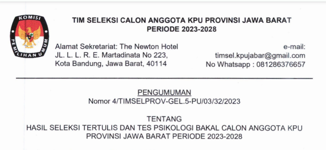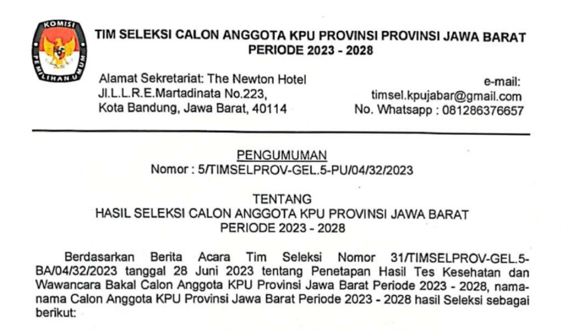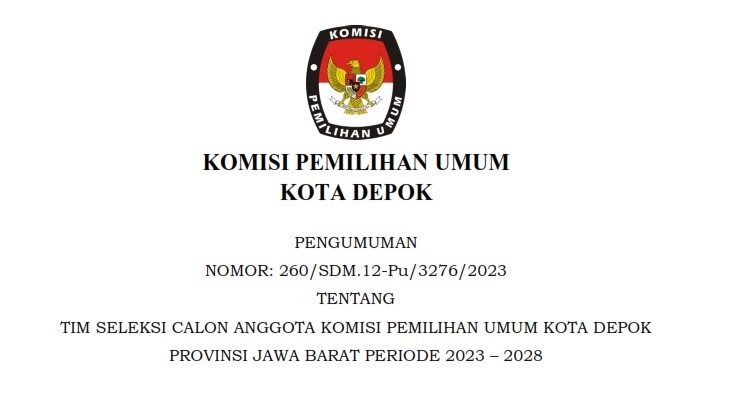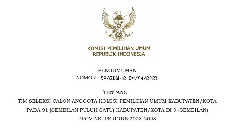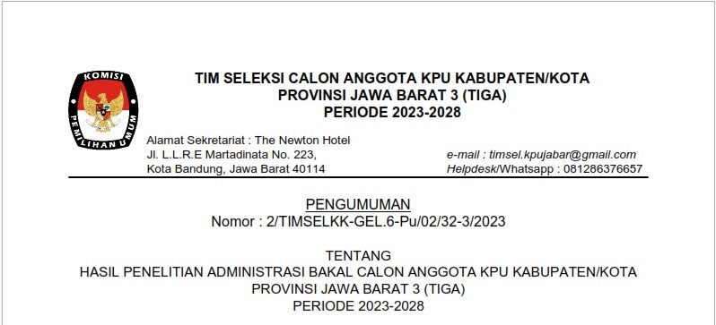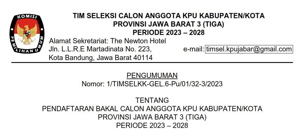 Berdasarkan Keputusan KPU Nomor 557 Tahun 2023 tentang Jadwal dan Tahapan Seleksi Calon Anggota KPU Kabupaten/Kota pada 91 (sembilan puluh satu) Kabupaten/Kota di 9 (sembilan) Provinsi Periode 2023-2028, dengan ini Tim Seleksi Calon Anggota KPU Kabupaten/Kota Provinsi Jawa Barat 3 (tiga) mengundang Warga Negara Indonesia yang memenuhi persyaratan untuk mendaftarkan diri menjadi Calon Anggota KPU Kabupaten/Kota: